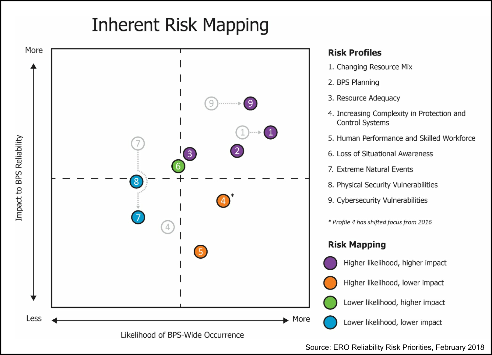 Risk management is a never-ending task for facility owners and managers. Today, electricity-related issues are high on the list of risks for facilities: increasing energy costs, an aging electrical infrastructure, restructuring of the utility business model, renewable energy mandates, rapid technology changes and cybersecurity issues. Moreover, the magnitude, velocity and potential impact of changes to the electricity-supply industry exacerbate facility risk management challenges. This is the first of a 2-part series. This first part examines the risks to the electricity supply and the second part will look at the options facility managers have to manage electricity-supply risks. Electricity Risks Ahead The North American Electric Reliability Corporation (NERC) oversees the reliability of all aspects of the bulk power system (BPS): what is commonly called “the grid”. The BPS includes the interconnected international electrical system of generation and transmission (>100 kV) plus all the utilities, infrastructure and control systems that deliver electricity to more than 334 million people in the U.S., Canada and parts of Mexico. A critical part of NERC’s oversight is an annual assessment identifying and prioritizing the risks to the reliability of the bulk power system. Shown is NERC’s 2018 risk assessment map. The horizontal axis shows the likelihood of grid-level problems occurring and the vertical axis shows the potential severity of such problems. Arrows show the change from the 2017 assessment. Item #4 shows no arrow since its position change was due to a modification of the risk definition.